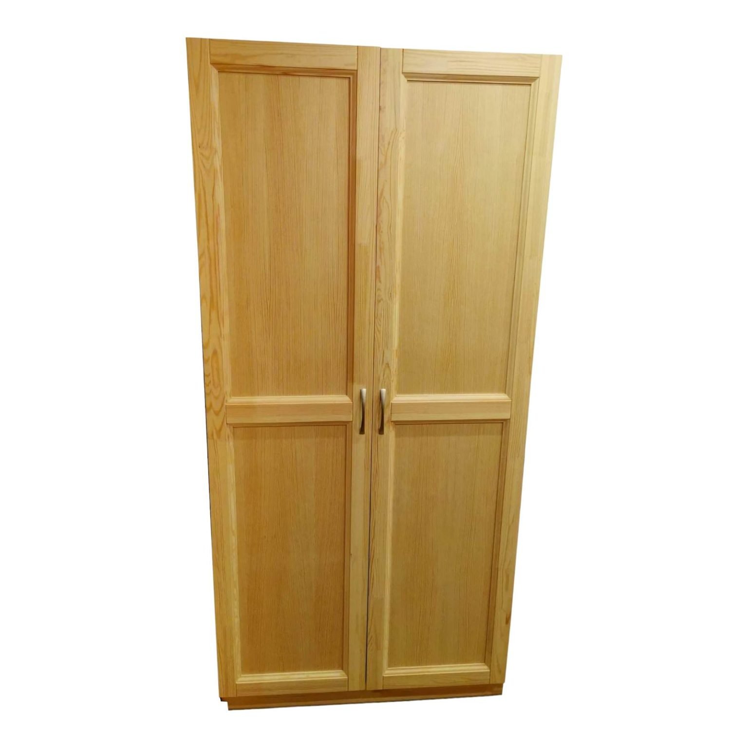 Stor garderob är gjord av furuträ. Bredden på garderoben: 800 mm, Höjd: 1867 mm, Längd: 690 mm. Trä tjocklek: 18 mm. Paneler produceras av fast eller finger gemensamma lameller som är radiella eller tangentiellt korn. Limfästning med modifierare D4 är enligt DIN EN 204.