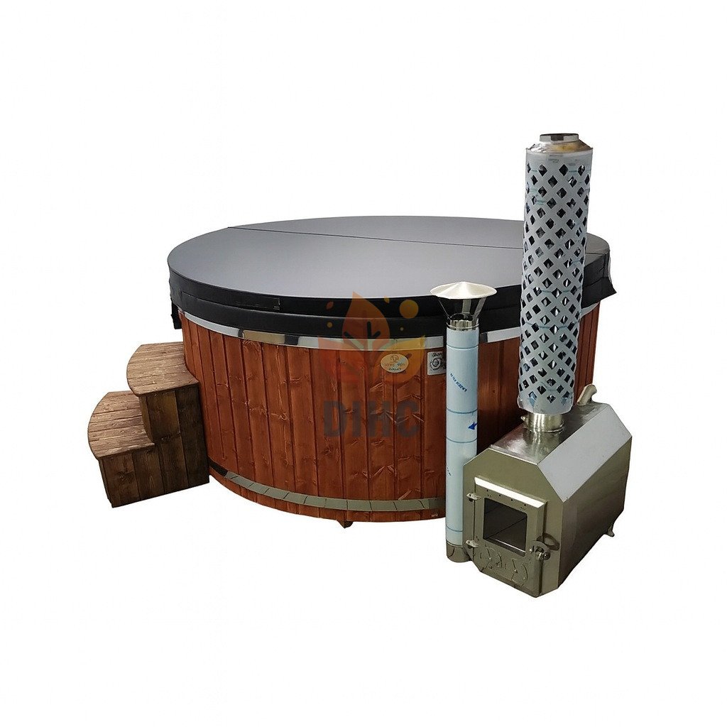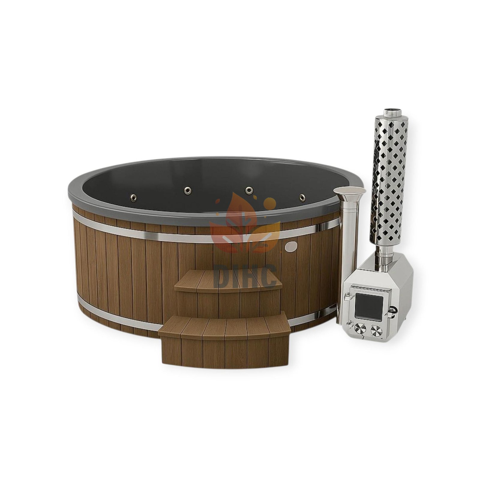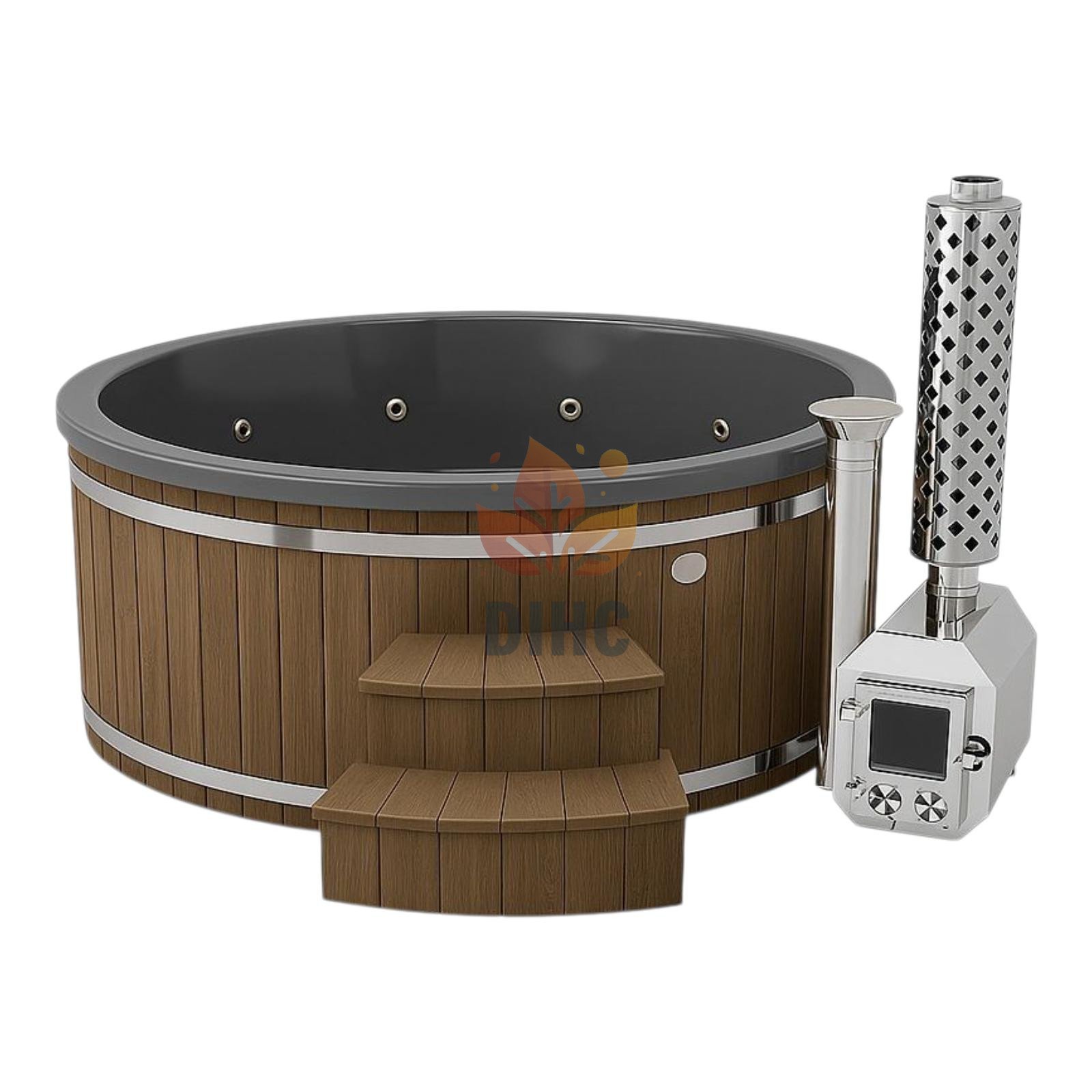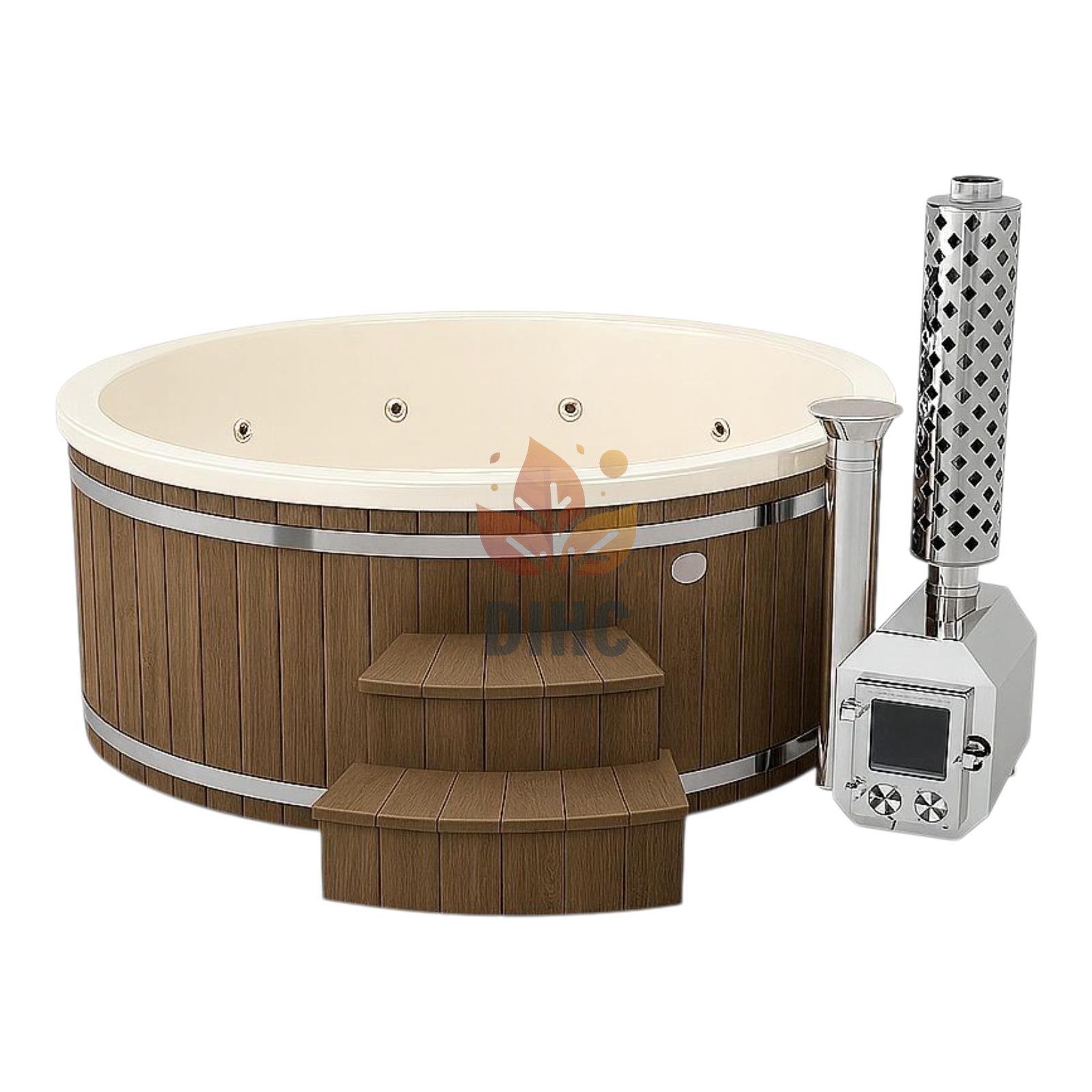 Slappna av i ett modernt vildmarksbad utrustat med en kraftfull 26 kW extern kamin, som värmer vattnet på 3–6 timmar beroende på väder och starttemperatur. Glasfiberinsatsen ger både stabilitet och lång livslängd. Du kan dessutom anpassa badet med LED-belysning, spasystem eller dekorativa paneler för en personlig stil. Därför passar den här modellen lika bra för privat bruk som för professionella spa-anläggningar. Slutligen får du en elegant och hållbar produkt som erbjuder avslappning året runt.